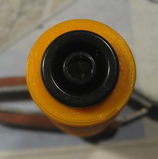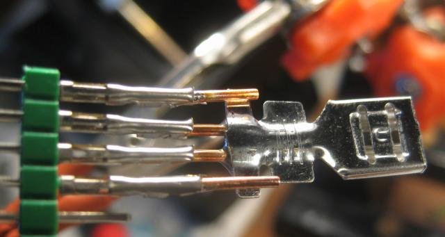 The parts are a 3D printed shell, a banana socket, a (female) spade (crimp) connector, four DuPont sockets and some thick wire.