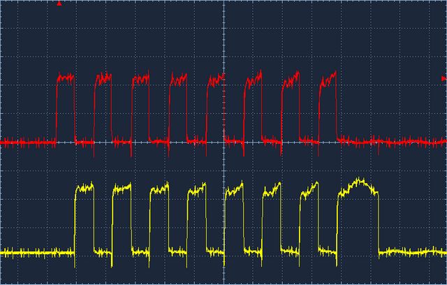 After that the board worked. The 'scope traces below show the drive signals to the transmit transducer of the unmodified board (2 V, 2 V and 20 μs) and the MAX232 modification (5 V, 5 V and 50 μs). One trace for each pin on the transmit transducer.