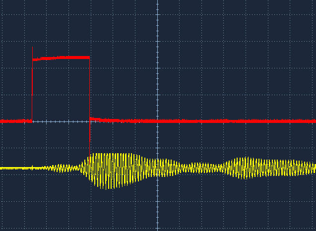 This screen shot shows the result of pointing the HC-SR04 into the void, no objects in range. Red is the final amplifier output, yellow the echo pin. Everything visible is the direct pulse from transmitter to receiver. At 200 μs per division, this lasts for 1.2 ms; one can observe that to get rid of this effect the sensor target distance has to be over 200 mm. Seeing this explains the time varying threshold used on the HC-SR04's comparator. Echoes from distant objects will return a voltage less than the direct signal, the HC-SR04 has to be able to detect them, but it must not trigger on the direct signal. The solution is a threshold which prevents triggering on low level signals until the direct pulse has decayed.