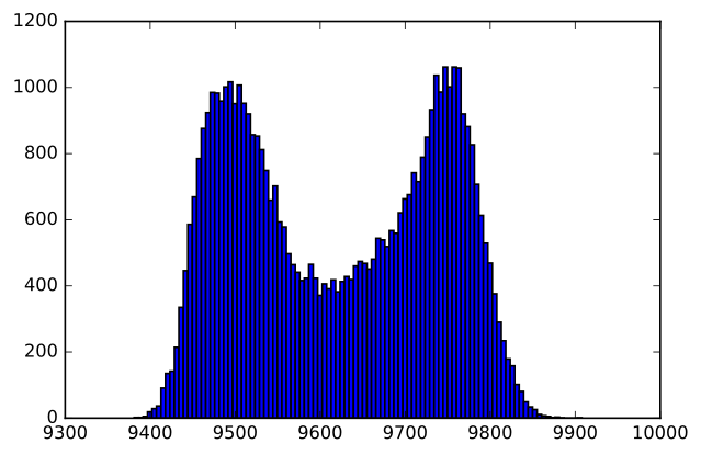 The histograms do not look very random. As a crude test I plotted the inverse time of cycle N against that of cycle N+1. It seems that a short cycle is followed by a long one. I found a similar histogram in [4], which says it represents "deterministic jitter".