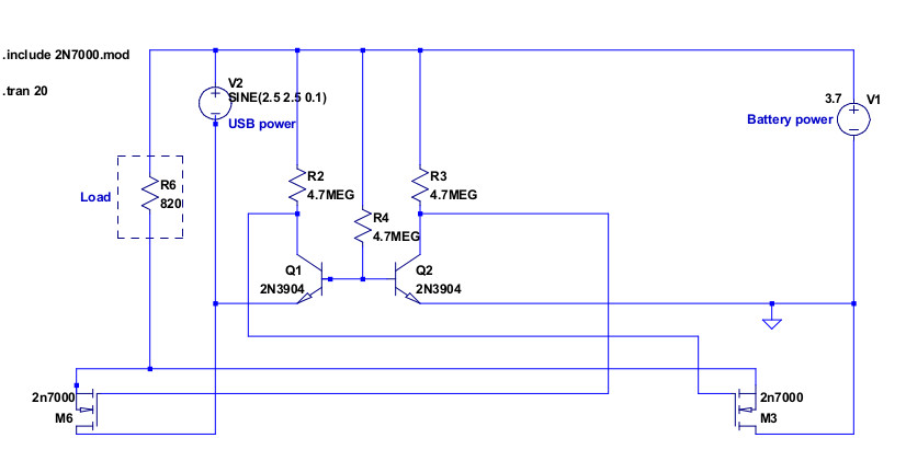 From these points I ended up with two FETs, one to switch power from USB and one from the battery. When an FET is supplying power its substrate diode is forward biased, which means its source is positive with respect to its drain. Ignoring the gate signals, the circuit amounts to replacing two diodes with two FETs, in such a way the FET substrate diodes replace the conventional diodes. This circuit will work, the forward drop is around 0.6 V. It provides a limit on how badly the circuit can perform. If the switching signals fail completely then power will still be supplied to the load from which ever source has the higher voltage.