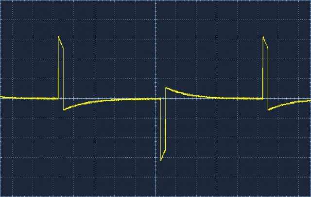 Oscilloscope screen shot at 200 ms by 500 mV, notice the drive signal swings both sides of zero Volts.