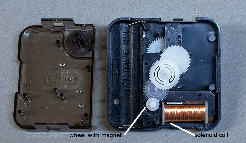 Quartz analogue clock movement, back of case, David PillingQuartz analogue clock movement, clip on panel removed, David PillingQuartz analogue clock movement, top set of gears removed, David Pilling