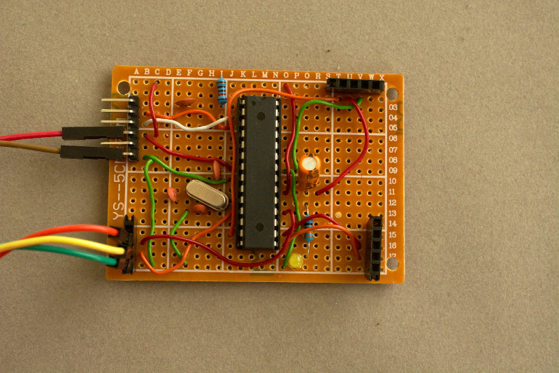 Photos of the complete project; click to see large version. The set of six horizontal pins at the top left of the board is where the FTDI USB TTL serial board is plugged in, when (as shown) this is not in use the 5v battery box is connected to the two power pins. The prototype board has a 0.1" matrix.