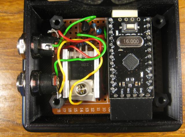 Using a micro-controller might seem excessive, but as soon as I decided to improve performance by comparing the signal from the sensor with the LED turned on and off, it looked a good choice. There is a hole in one side of the box that the Pro Mini can be programmed through using the usual six pin header.
