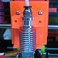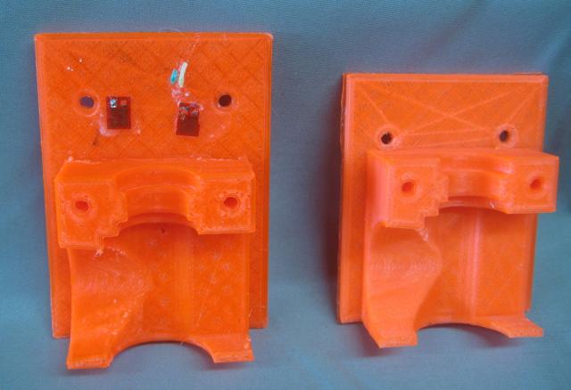I changed the back part of my E3D V6 Bowden Mount to give a slightly bigger distance between the holes that attach it to the X axis and the plastic that holds the E3D. This gives somewhere to stick the strain gauge and probably makes it a bit more bendable. I decided where to put the strain gauge on the basis of guessing where the part would break if bent enough. The orange material is PETG, I also produced a PLA version with similar results. There are two strain gauges because I damaged the first one whilst fixing it to the mount - see Strain Gauge for more technical details including the HX711.